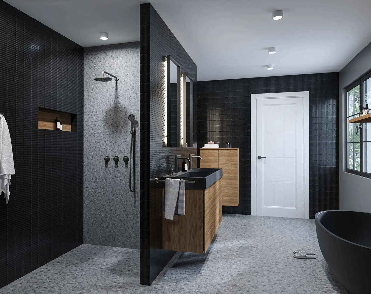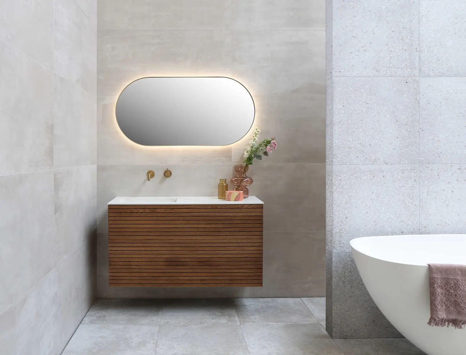 Combineer de Smooth wastafel met lichte tinten voor een kalme uitstraling zoals de INK kleur mat kasjmier grijs.