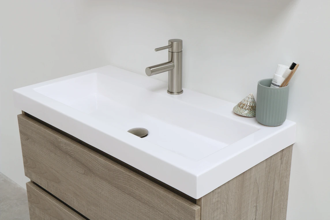Greeploze onderkast met twee lades van fineer eiken. Perfect te combineren met de 40 cm diepe wastafels. Verkrijgbaar in vier verschillende breedtematen en vier verschillende kleuren.